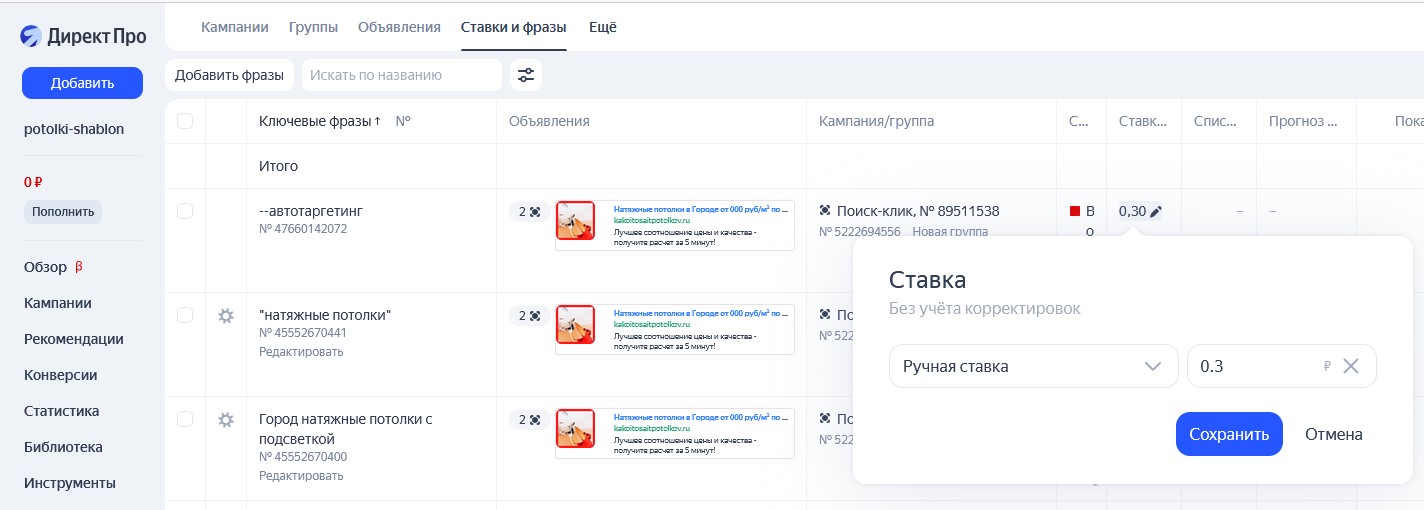 Оставьте только целевые. Если, например, речь о натяжных потолках, все фразы должны содержать в себе «натяжные потолки». И никаких окон, дверей, ремонтов, дизайнов. Все это вы можете пробовать добавлять на этапе расширения аудитории, но только после того, как аккаунт заработает эффективно.