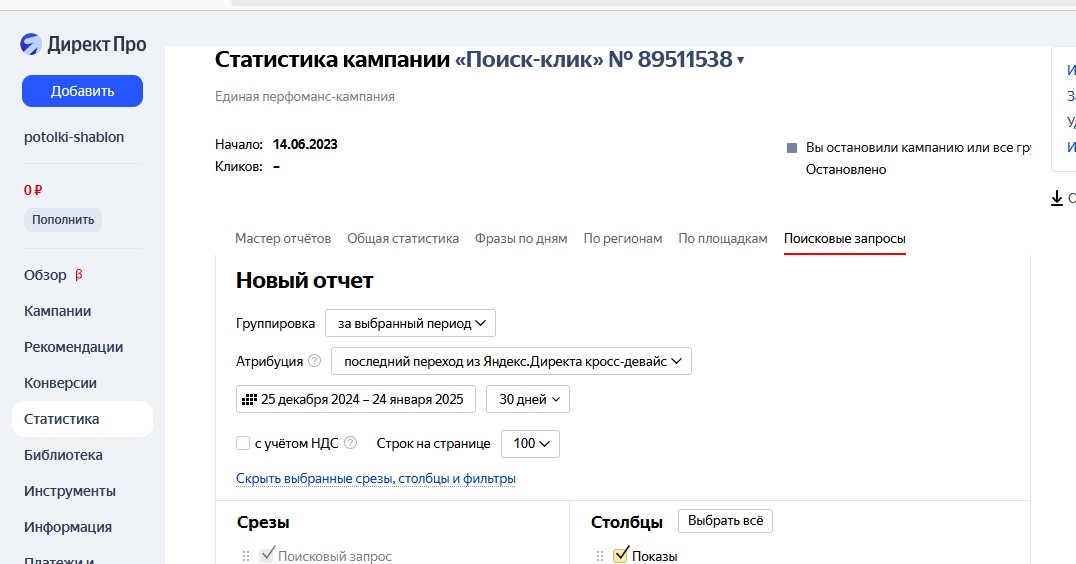 На Поиске проверяем статистику. Если в столбце Поисковые запросы видим показы по явно нецелевым, добавляем такие запросы в список минус-фраз.